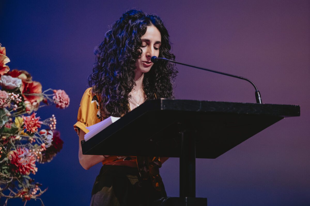 Tijdens het programma Tussen Vrijheid en Schuld droeg schrijver en journalist Mina Etemad een persoonlijke tekst voor over dans, verzet, verbondenheid en de last van het getuigen.